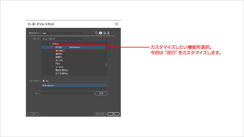 次に、カスタマイズしたい機能を選択します。 今回は"改行"をカスタマイズします。